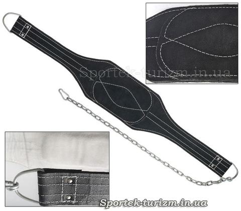 Виготовлений з гнучкою і товстої натуральної шкіри. Забезпечує максимальний комфорт при виконанні вправ і відрізняється довговічністю. Ланцюг і кільця виконані зі сталі підвищеної міцності.