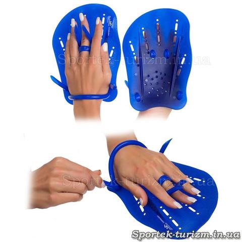 Для плотной фиксации лопатки на руке используются эластичные регулируемые жгуты, позволяющие лопатке (лапе) плотно прилегать к ладони при гребке.