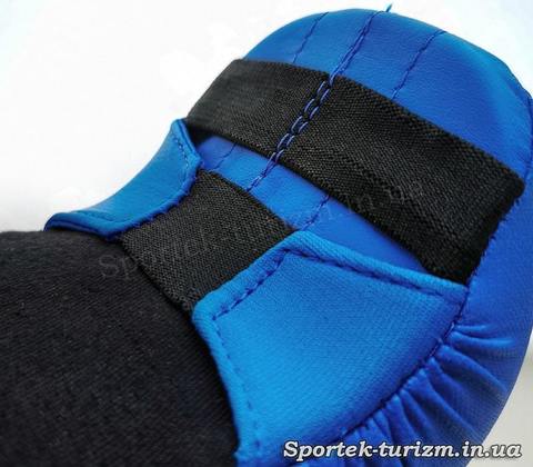 Перчатки крепятся с помощью пары широких усиленных резинок на ладони. Дополнительным фиксатором служит манжет на резинке. Большой палец полностью открыт.