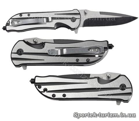 Накладки на рукоять выполнены из алюминиевого сплава, имеются декоративные вырезы по всей длине. Присутствует стальная клипса для переноски ножа в положении Tip-up, а также отверстие для темляка. Бекспейсер выполнен из алюминия.