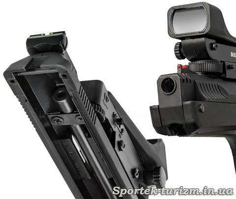 На мушці і регульованому по висоті і горизонталі цілику використовується світлозбираюча нитка, завдяки якій можлива стрілянина при поганій освітленості. Для більш комфортного прицілювання і поліпшення точності стрільби зброю оснащено коліматорним прицілом з можливістю регулювання.