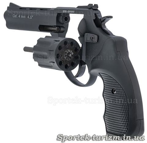 В нем стальной 9-ти зарядный барабан с экстрактором для быстрого извлечений гильз. Барабан легко достается, сдвигая блокиратор на левой стороне пистолета вперед большим пальцем руки, и откидывая его влево от стрелка.