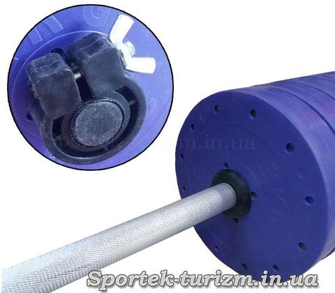 Диски на грифе фиксируются специальными замками-хомутами с зажимами в виде винтового барашка.