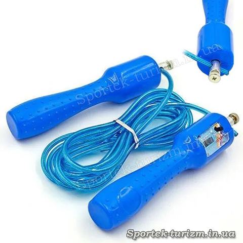 Зручна і легка скакалка з лічильником, пластмасовими ручками і тонким сталевим тросом в оплетке 270 см.