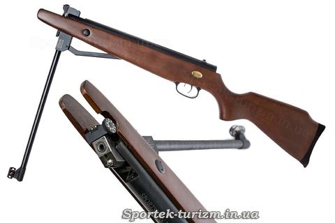 Для зарядки и взведение курка винтовка переламывается в вертикальной плоскости.